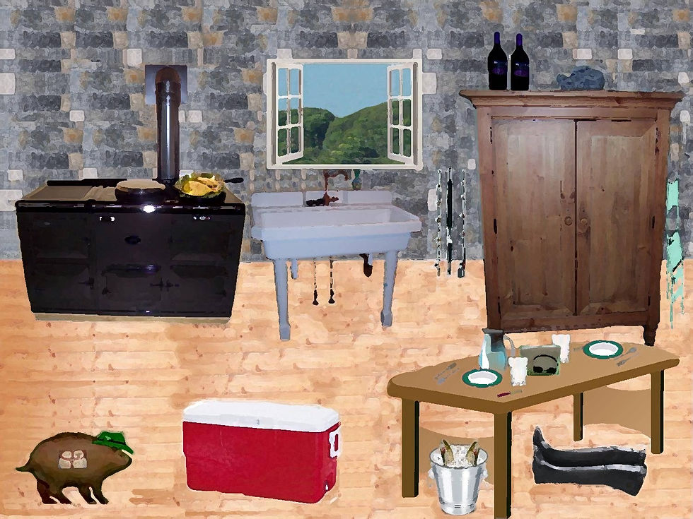 Yes sirree, it was a great but most unusual day for fishing. Didn't really settle anything between granddad and me. Hard to tell whose ideas and techniques are better when it don't matter what you throw in the water. As we packed up to go back up to the cabin, we sorta decided right there and then that we'd have to try a more challenging spot the next day. Give ourselves a real test. Have to admit that granddad did catch the biggest fish though. Didn't lord it over me though... after all it was only an inch longer and just a tad heavier than my biggest. Didn't really matter though. After we got 'em all cleaned and prepped for cookin you couldn't tell which one was caught by who. Hmmmm hmmmm. Once those fillets were floured and breaded they cooked up real good. Course we only cooked up a couple. Most of the rest we froze for later... just in case we didn't have as much luck over the next couple of days.